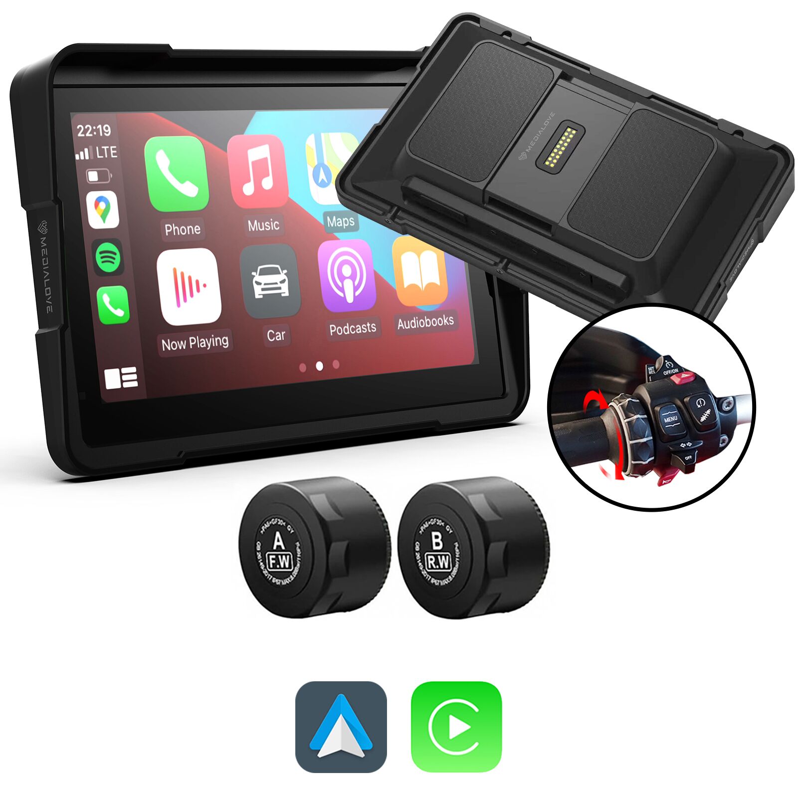 Urządzenie zapewnia bezprzewodowe Apple CarPlay oraz bezprzewodowe Android Auto, przenosząc kluczowe funkcje telefonu na ekran motocykla. W jednym miejscu dostępne są m.in. mapy, muzyka, komunikacja i wybrane aplikacje.