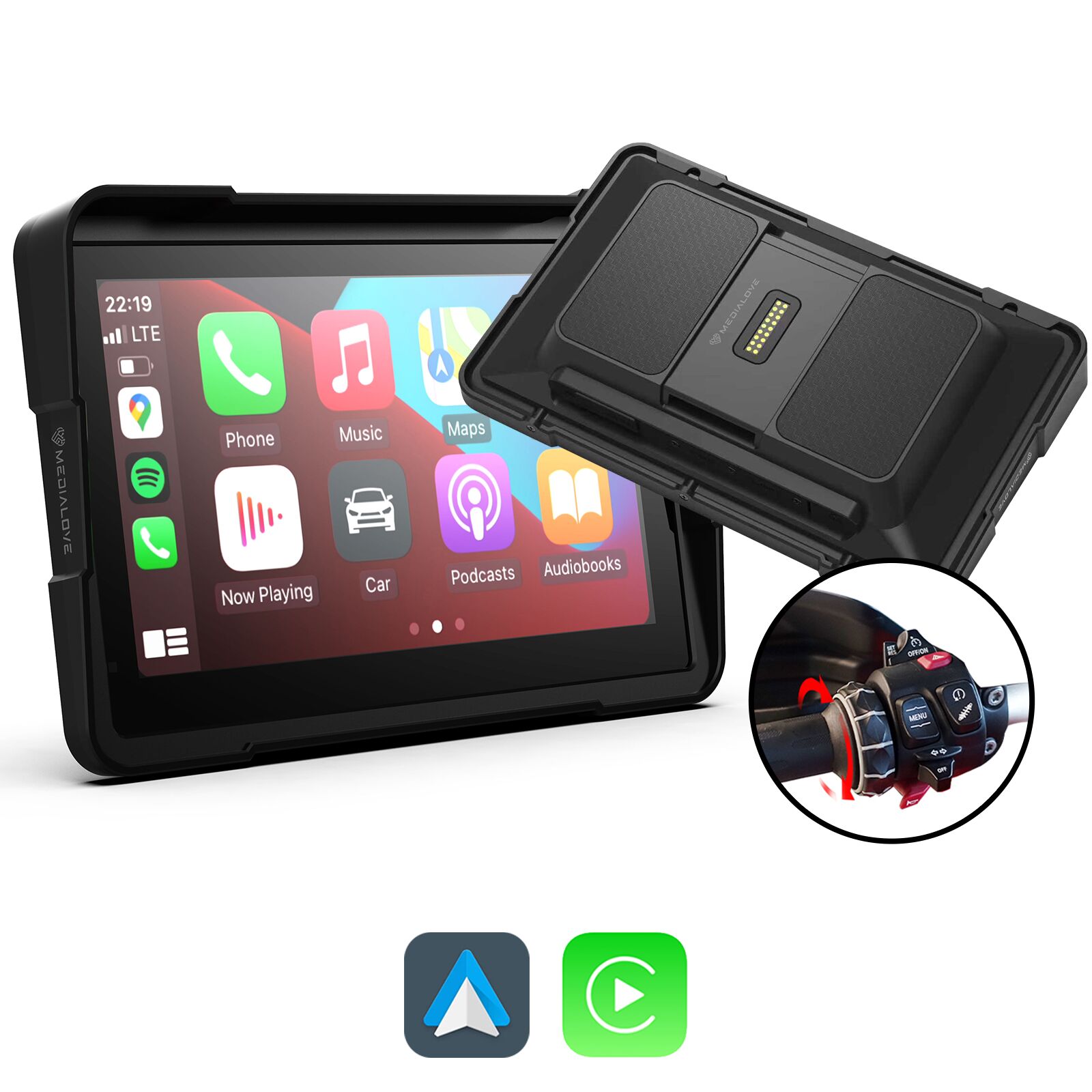 Urządzenie zapewnia bezprzewodowe Apple CarPlay oraz bezprzewodowe Android Auto, przenosząc kluczowe funkcje telefonu na ekran motocykla. W jednym miejscu dostępne są m.in. mapy, muzyka, komunikacja i wybrane aplikacje.
