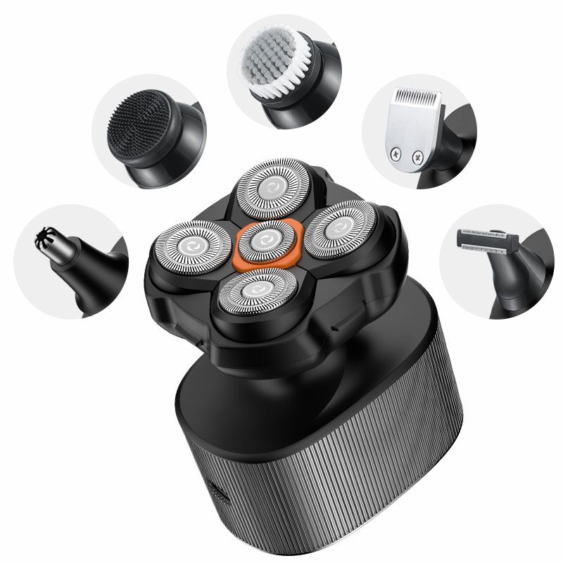 ⭐ 6 w 1 – kompleksowa pielęgnacja – trymer do brody, trymer do nosa i uszu, szczoteczka do oczyszczania twarzy, nasadka do masażu, głowica goląca z 5 ostrzami rotacyjnymi 360°, trymer z nasadkami dystansowymi.