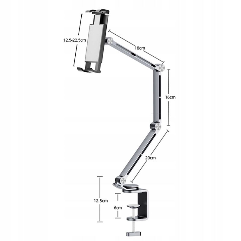 Pasuje do smartfonów i tabletów o szerokości od 4 do 12,9 cali. Montaż jest szybki i prosty dzięki zastosowaniu solidnego zacisku biurkowego.